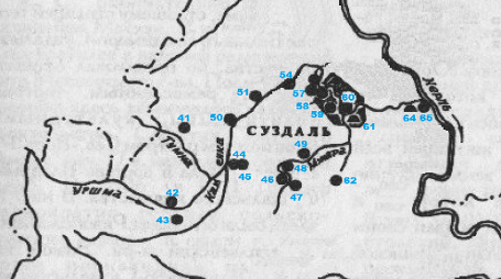48 Селище 4, X-XIII вв. Расположено в 1 км. к северо-западу от села Гнездилово, правый берег р. Мжара. Протянулось вдоль берега, размеры ок. 220х80 м., высота над рекой 6 м. Керамика лепная, мерянского типа и гончарная древнерусская.